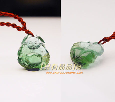 精品碧绿色碧玺挂坠,正面小佛,背面荷叶。晶体干净,颜色明亮,下浓上淡,雕工精细。