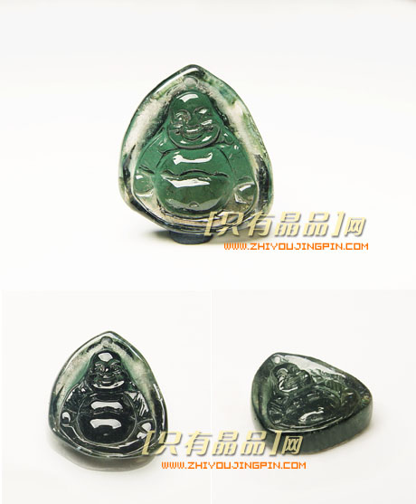 精品双色绿碧玺佛挂坠,这块挂坠本是三角形的碧玺原石,外皮是绿色,内皮是白色,内部的晶体是碧绿色。就是利用了晶体中的绿色部分雕刻了佛的造型,而且晶体干净,颜色鲜艳。雕工也十分精细,只是照片上不能体现。