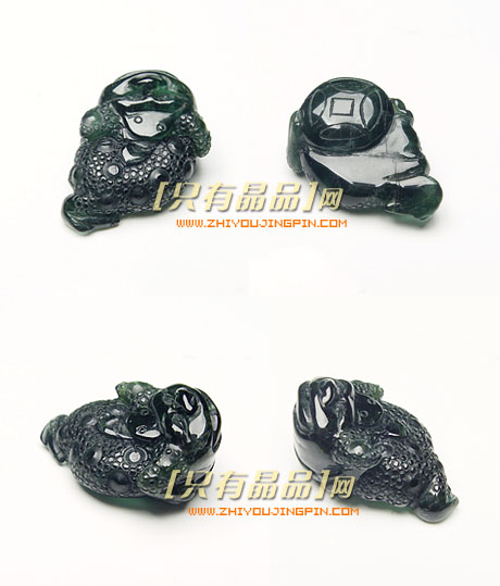 精品碧玺三脚蟾挂坠,晶体半透,颜色是深蓝绿色, 雕工特别精细。