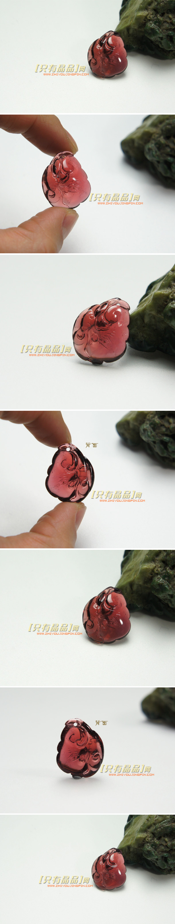 极品玫瑰红色碧玺雕刻如意吊坠。