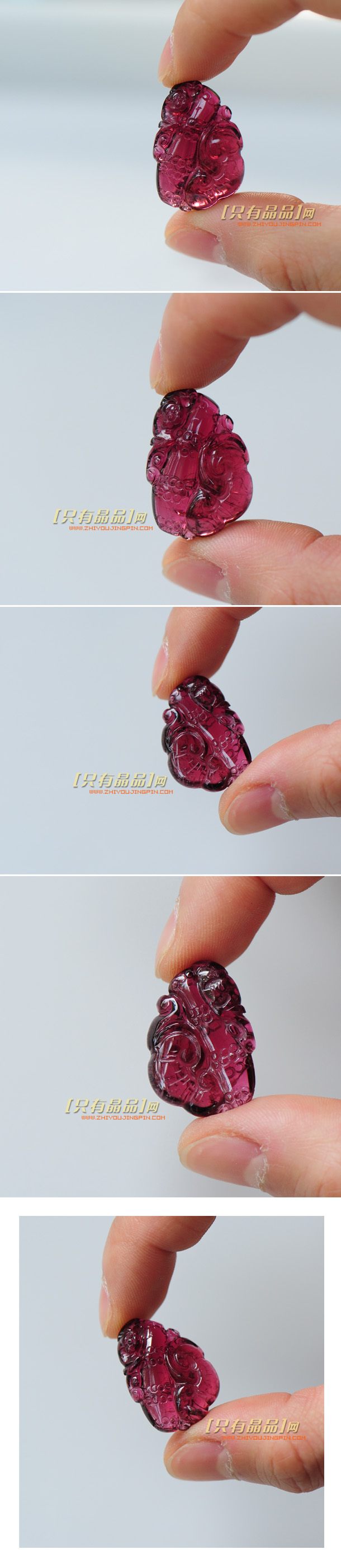 极品玫红色碧玺雕刻竹节如意吊坠。颜色鲜艳,晶体清透,仅有细微纹理。