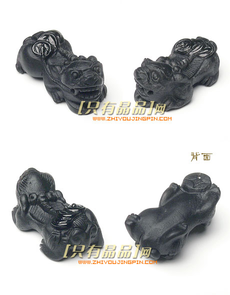 精品黑曜石貔貅雕刻挂坠,石质乌黑无杂色,貔貅部分采用磨砂工艺,呈亚光质感,貔貅背上的金钱采用抛光工艺,雕工精细,品质完美。