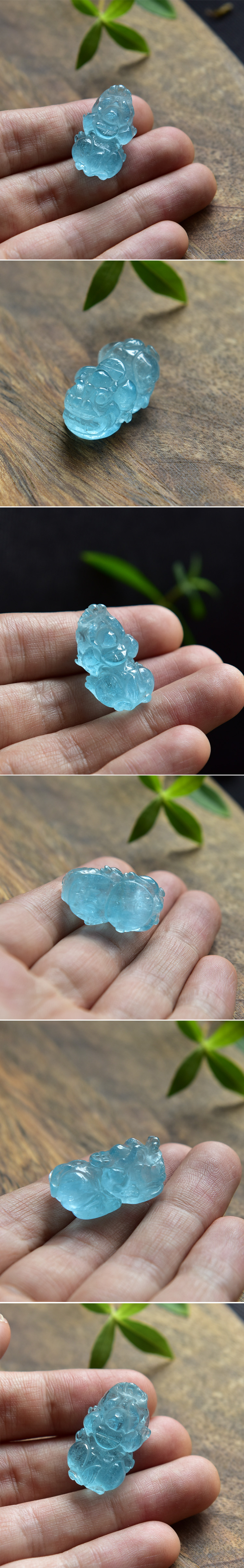 精品天然冰种海蓝宝石雕刻貔貅吊坠。冰种的海蓝宝产量很少,而且大多比较小颗,所以成品往往只有小颗的珠子才能看到冰种透体的。而大颗的冰透体海蓝宝石很难得,而且颜色还很蓝,蓝得艳丽,一点不灰不暗,质地看起来特别水润。难得的是这颗貔貅形态中正,体态饱满,不是那种料形有天然缺陷的,海蓝宝的原矿石都是柱状形态,要很粗的蓝蓝的柱子才行,这样的原料都是少有的精品。雕工采用大部分透水的工艺来衬托出晶体本身的亮度,成色非常难得,值得收藏的精品。