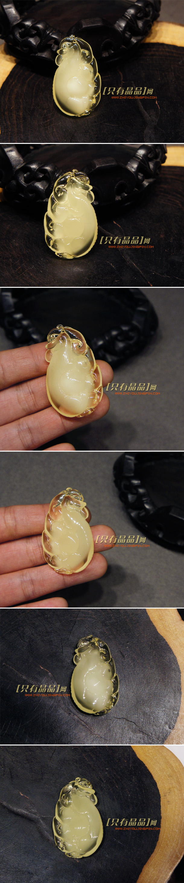琥珀-金绞蜜蜡雕刻金瓜貔貅挂坠。这块琥珀晶体清透干净,里面已经开始有蜜蜡化的云雾状,边缘部分仍然清透,雕刻工艺很精细。