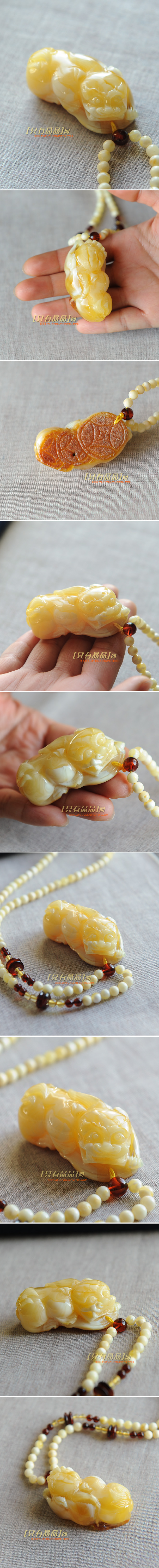 大颗琥珀雕刻件-带皮蜜蜡雕刻貔貅吊坠。底部是完整的石皮,貔貅部分是双色花蜡,貔貅很大颗,而且虎头虎脑的很神气。