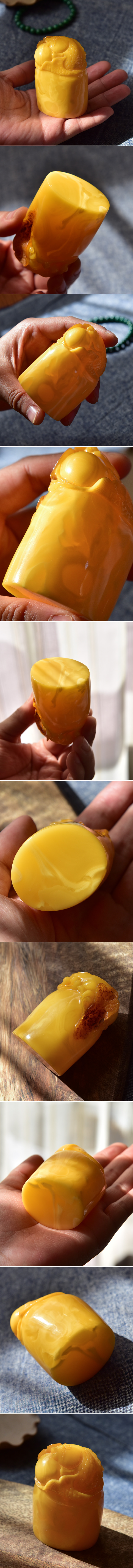 精品天然琥珀章料-大块蜜蜡雕刻印章藏品。任何品种的琥珀都是越大颗价值越高,这颗印章大颗形正,强光下有微透的效果,质地如凝脂一般,说明蜡质非常细腻。印钮是传统的富贵有余题材,借用一小部分石皮做荷叶的巧色设计,难得的大颗精品,收藏价值很高。