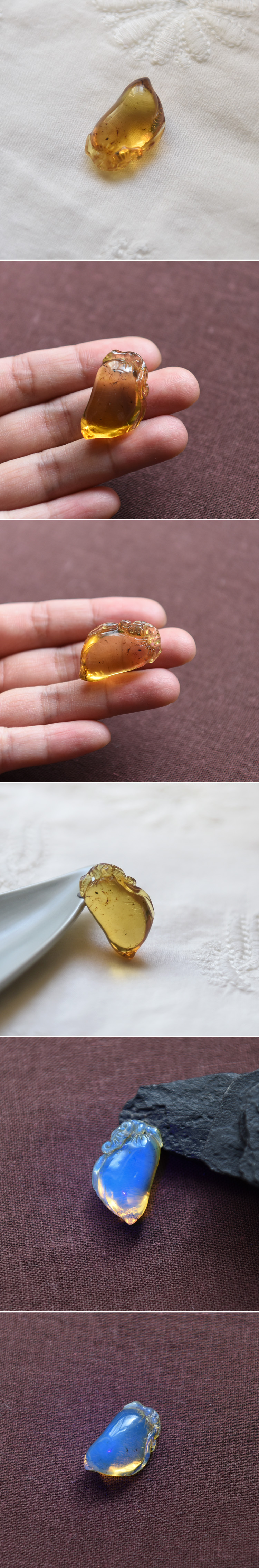 极品蓝珀雕刻福瓜吊坠。晶体呈浅黄色,带有少量杂质,雕工精细,小巧精致,在紫光灯下蓝光非常明显。