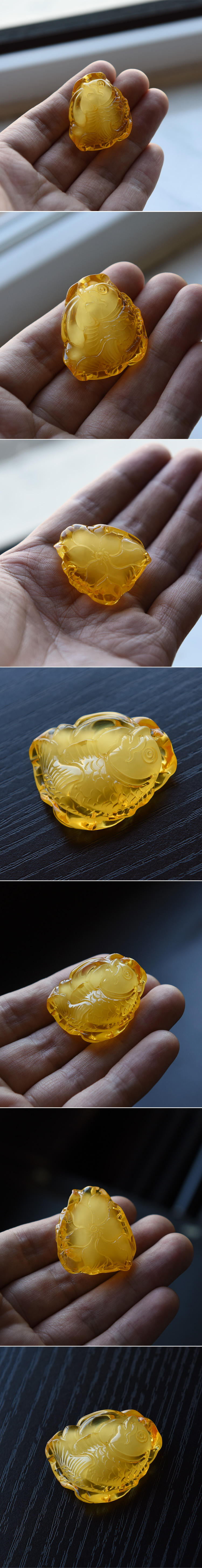 波兰天然琥珀蜜蜡,极品金绞蜜雕刻雕刻年年有鱼吊坠。形态中正,雕刻造型饱满,晶体干净没有杂质。外围是清透的琥珀,内部是半透明的蜜蜡,有水汪汪的质感。