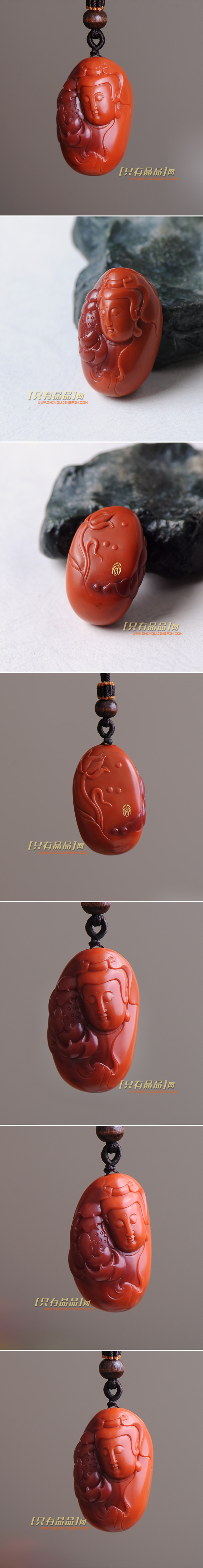 极品南红玛瑙(赤玉)-苏工玉雕名家作品-莲花观音吊坠,带落款。高纯柿子红、玫瑰紫双色巧色,颜色纯正,质地细腻。隋唐风格的观音多了些脱俗和雅致,其美感的刻画也非一般雕刻工匠所能把握。无论是工还是料都非常美,值得收藏。