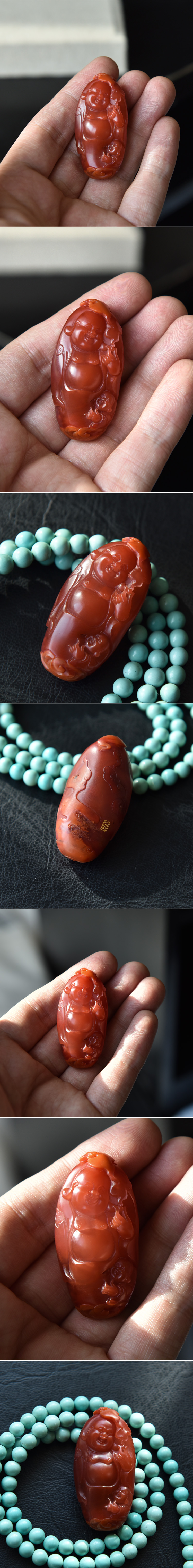 极品联合料苏工南红玛瑙,苏工大师黄文中雕刻“问道”挂坠。料子胶质感很强,颜色红艳,灯打半透,雕刻的人物表情非常生动,设计上有情节感和趣味性,带“文中”款,是我很喜欢的一件作品。