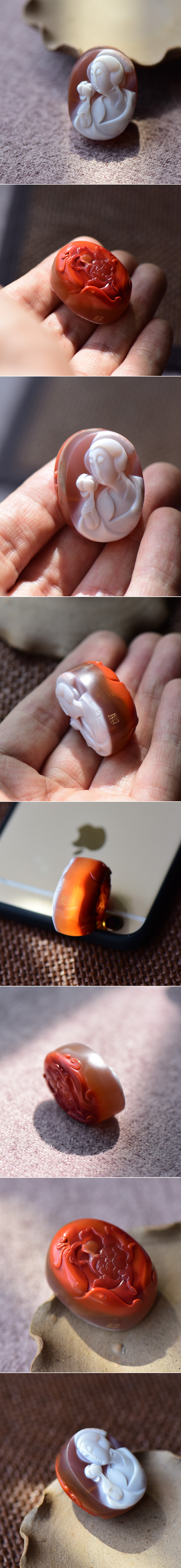 极品天然南红玛瑙吊坠,苏工名家沈杭俊大师雕刻仕女挂吊坠,带落款。一块料子集果冻料、高瓷白、锦红和柿子红为一体,仅仅是这样的一块料子已经很难得了,经过沈杭俊大师的巧思设计和精细雕琢,形成了一件工艺精湛格调高雅的艺术作品。