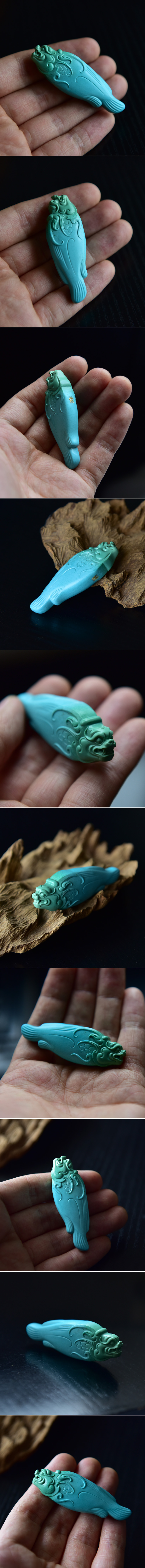 极品天然原矿蓝绿松石苏工鱼化龙雕刻件。非常难得的蓝绿双色松石,巧雕仿古汉代鱼化龙。赵文金大师是苏州玉雕仿古玉题材的代表人物,可以用最简练优美的线条给人以最极致的艺术美感,而且一块松石作品具有蓝绿双色又是万中无一的,具有很高的收藏价值。