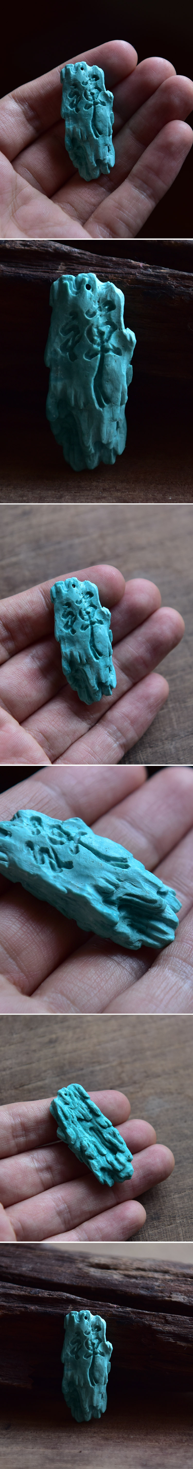 原矿绿松石雕刻“禅”吊坠。整体雕刻成一块岩石,岩壁的字和石头的形态非常协调,整体看起来就是舒服。没有抛光,这种风格不适合抛亮光,上色也更快。