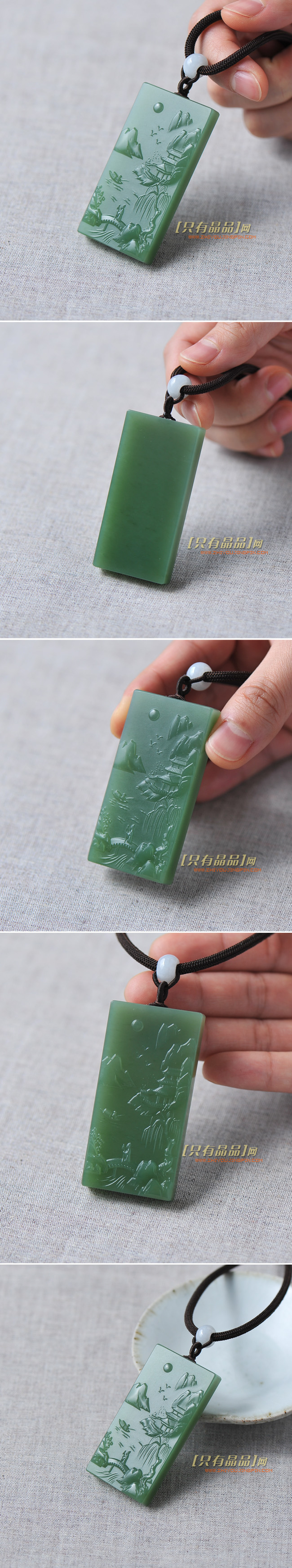 极品俄碧玉方牌苏工雕刻吊坠、手把件。颜色均匀,大块方牌没有黑点(俄碧玉中最常见的黑点),非常干净;质地细腻,对强光看有柔和的半透质感,仅仅是这样纯净的无雕刻的牌子都很难得;雕工精细,意境悠远,值得收藏。