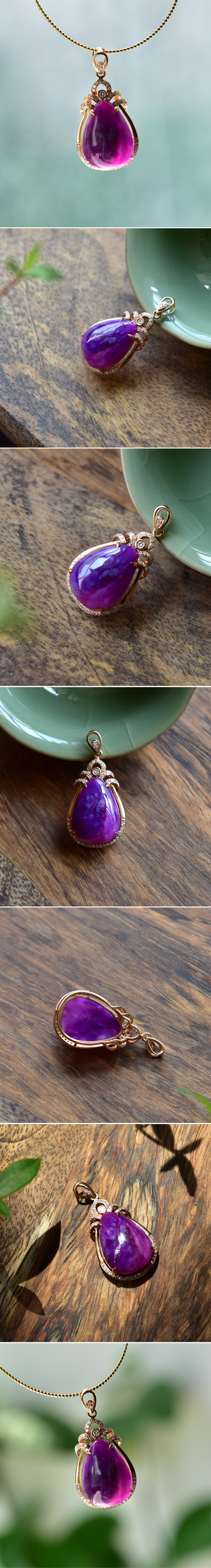 精品冰种皇家紫红色天然舒俱来吊坠18K金配54颗天然钻石镶嵌。冰种晶体在阳光下会有半透的质感。在室内看颜色是粉紫色,在阳光的照射下是紫红色,非常值得收藏。