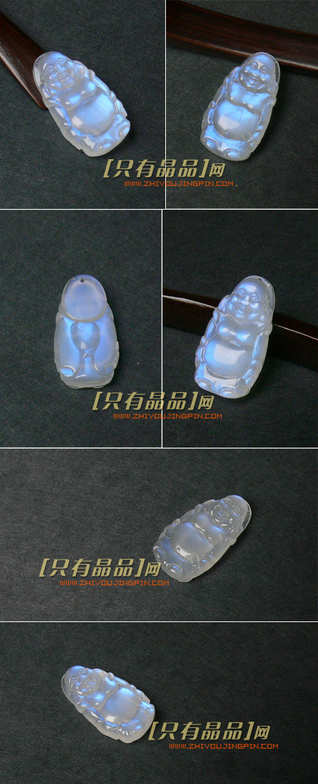 极品月光石雕刻站身弥勒佛吊坠。晶体干净清透,没有月光石常见的杂质,仅有细微的内部纹理,这在月光石中属于非常难得的品质。最重要的是表面的蓝光非常明显。雕工精细,晶体品质和光晕都很好。