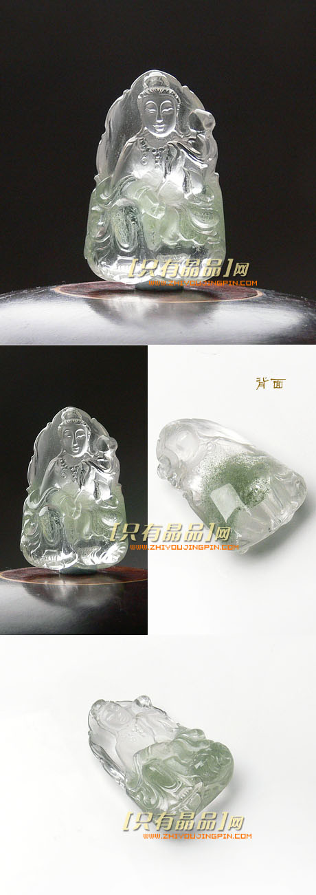 精美的绿幽灵观音挂坠。晶体清透无棉絮,绿色矿物质干净,不带其他杂色矿务。雕工极其精细,磨沙与抛光工艺相结合。神态自然安详,各方面都相当完美。
