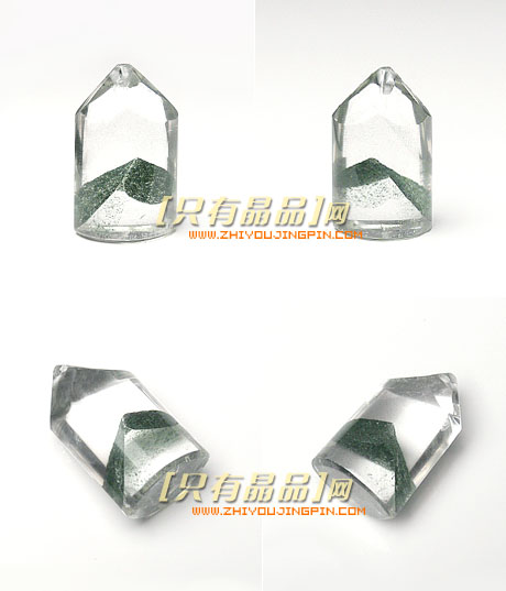 金字塔:包含绿色火山泥灰等內涵物,在通透的白水晶裡,浮現如雲雾、水草、漩渦甚至金字塔等天然异象,至今沒有任何學者專家能解釋,為何水晶內会出現一個完整的、和古埃及金字塔一模一樣的金字塔?一重重整齊的绿色影子,其實就是地质改变的日記!