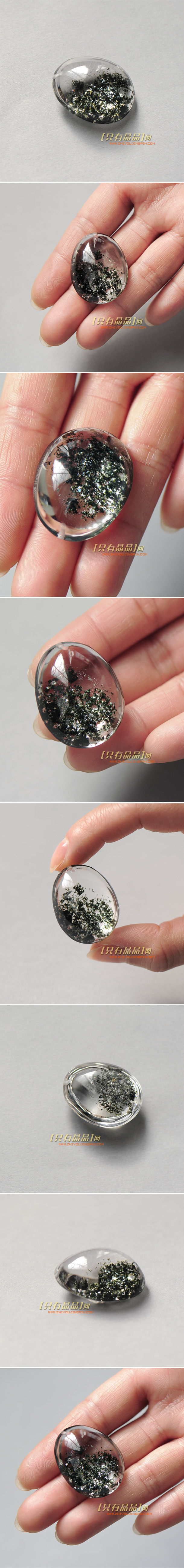 精品绿幽灵清透挂坠。晶体是清透明亮的的白晶体,矿物质在晶体的背面,从正面欣赏很漂亮,带有亮光。而且矿物质是深色的海藻绿色,深绿色的矿物质更衬托了明亮的晶体,品质上乘。