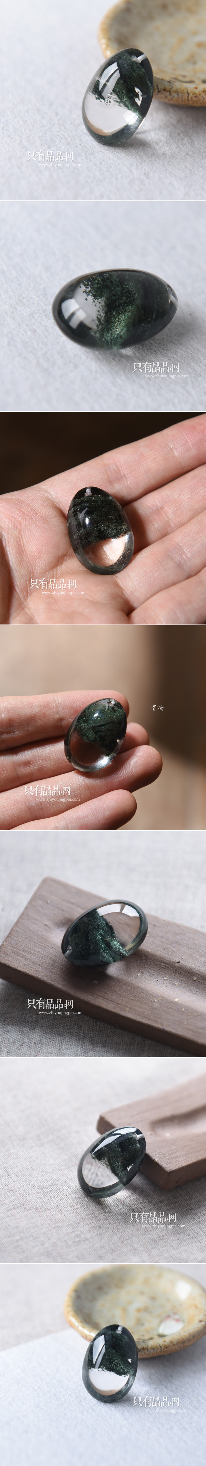 极品墨绿色绿幽灵吊坠。晶体非常全净无棉。下半部分是清透的晶体,上半部分是绿色的矿物质,是深绿色的,质感强,感觉像是空中飘着的云。