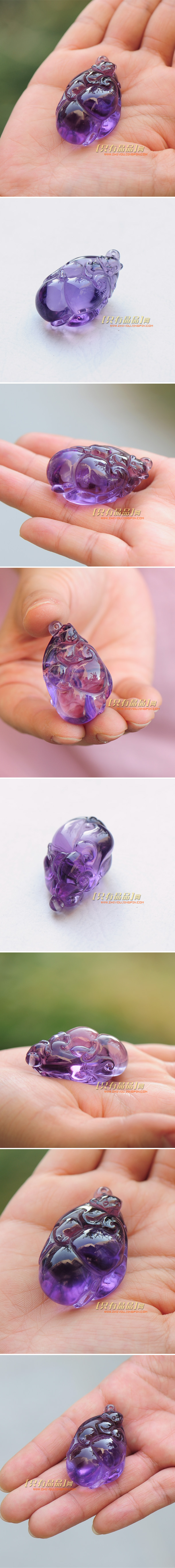 精品大颗紫水晶雕刻福禄如意吊坠。晶体大颗且清透,仔细看仅有极细微内部纹理。颜色干净鲜艳,雕工采用大面积透水,来体现晶体的清透和颜色的艳丽。