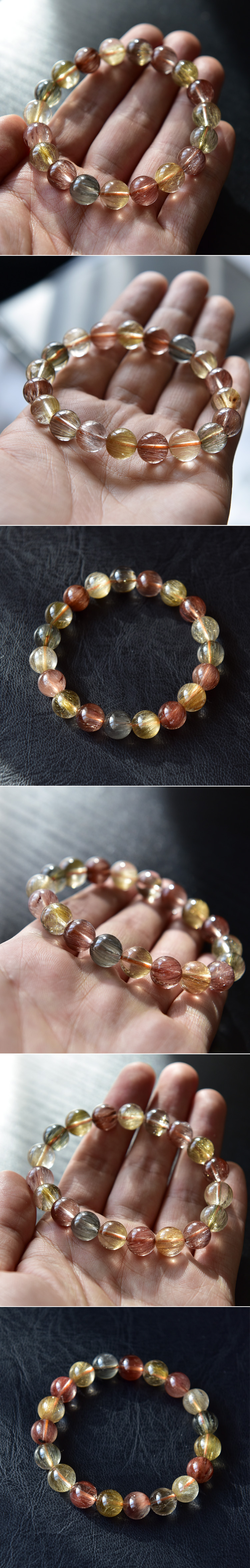 10mm极品彩色发晶福禄寿圆珠手链。这种福禄寿是彩色发晶中少见的品种,他的发晶的发丝在光照下是带有金属光泽的,因此也叫彩金发水晶,这条不仅发丝的金属光泽非常强,而且基本以顺发为主,值得收藏。