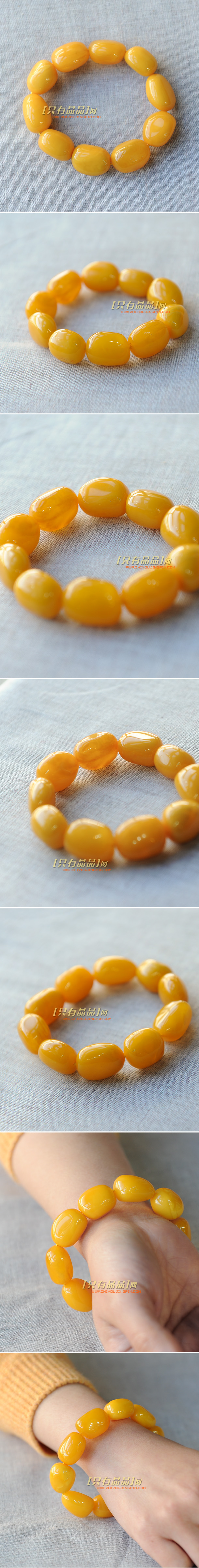 超大颗极品波罗的海随形老蜜蜡手链。颜色浓郁,就是很多人说的鸡油黄,质地细腻温润,表面带有油光。