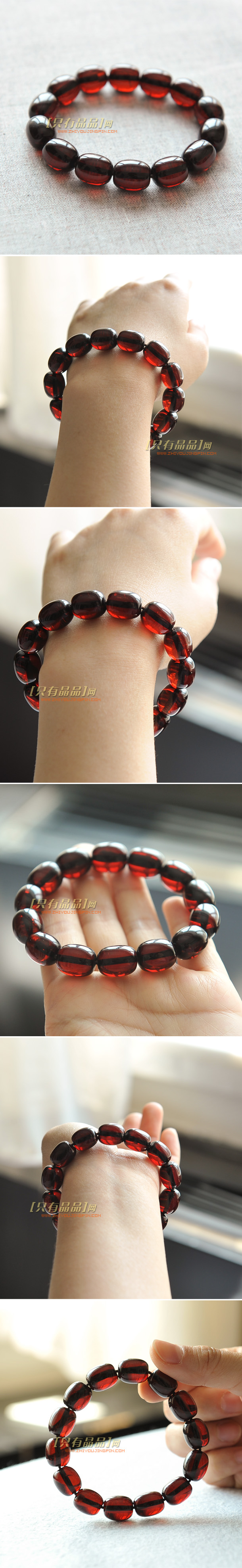 极品波罗的海血珀算桶珠手链。晶体清透,有着漂亮的红葡萄酒色泽,这种颜色比较深沉,但是透光看又很清透,一点不混浊。