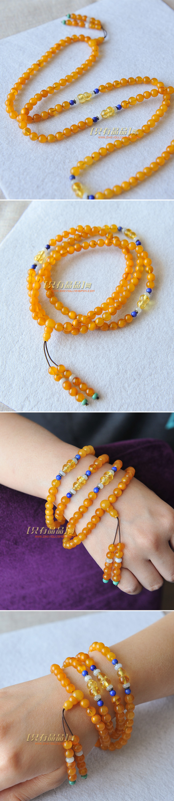 极品海珀-鸡油黄色老蜜蜡108颗佛珠手链。颜色很漂亮,纯天然无烤色的鸡油黄,配上等的翡翠、青金石等佩珠,当手链正好四圈。