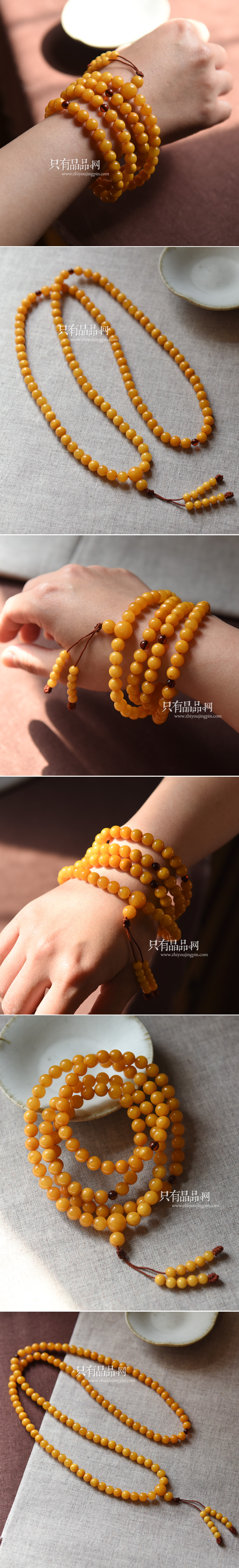 7mm极品老蜜蜡108颗佛珠。纯天然色,均匀又浓郁,表面带有油光。这个规格缠绕在手腕上4圈大小非常适合。