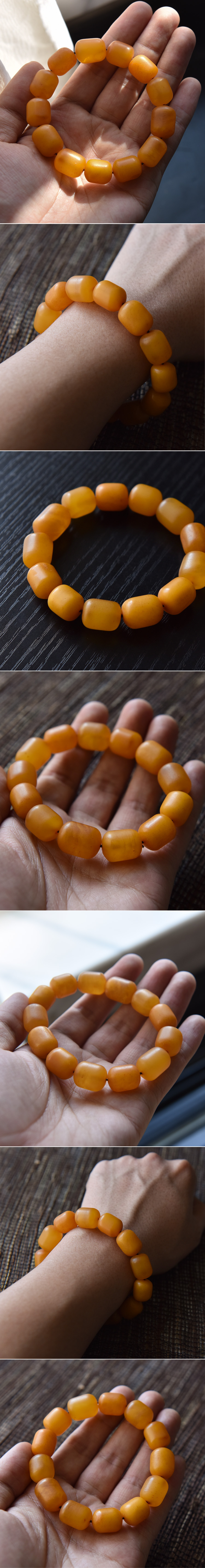 极品超大颗海珀桶形鸡油黄老蜜蜡手链。形态大颗饱满,颜色浓郁的鸡油黄色,晶体半透带有漂亮的流淌纹,形制敦厚规矩,颜色温暖又深沉,大颗的高品质老蜜蜡具有很高的收藏价值。
