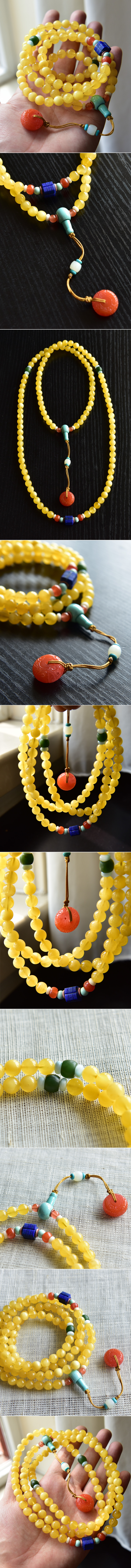 8.5mm极品金蜜蜡108颗佛珠豪华配置手链,全天然宝石无金属配件。同料蜜蜡,颜色均匀,干净明亮,有温和柔美的流淌纹,强光下半透质感。顶珠配无白青金石玉琮,出自苏工玉雕工作室,料子好雕工细,两侧辅以天然原矿松石珠,联合料南红玛瑙隔珠;腰珠配菠菜绿俄碧玉鼓形珠,海纹石隔片;三通佛头选用高瓷蓝原矿松石,外加白玉背云,南红玛瑙满工雕刻平安扣底坠,颜色艳丽的水红色,又大颗还无裂,为整体增色不少。特别要强调一下,所有配珠全部是天然宝石(没有金属配件),颗颗精挑细选,也在颜色、款式、形制方面做了深度考量,佩珠大多是独一无二无法量产的。
