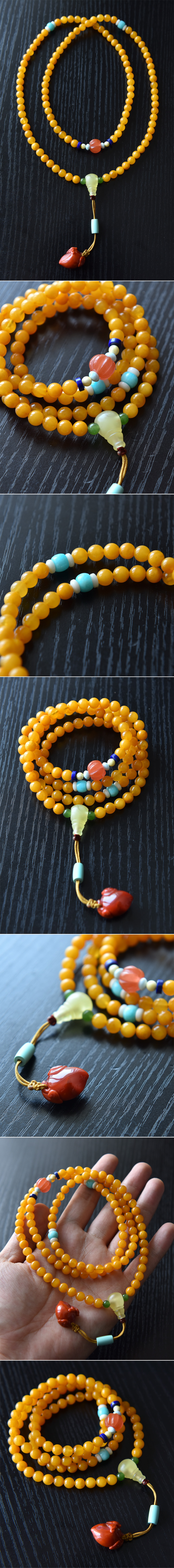 7mm极品鸡油黄蜜蜡108颗佛珠手链,戴手腕正好4圈。蜜蜡是同料鸡油黄,蜡质和颜色都很均匀,表面带有油光;顶珠配南红瓜珠,海纹石、白蜜蜡佩珠;鼓形天河石的腰珠;柠檬黄色的一体三通,精工手做;配管状绿松石背云,天然原矿而且没有铁线;底部坠以柿子红南红雕刻小寿桃。主石和所有配件都是精心挑选,设计精致用心,整体颜色明亮艳丽,这个规格缠绕在手腕上4圈大小非常适合。