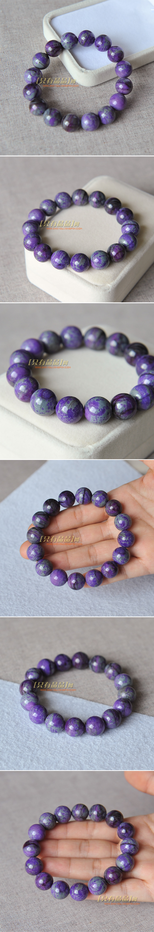 极品斑彩紫色舒俱徕手链,是鲜艳的高紫斑纹和灰色相间,颗颗如此,就像一幅幅抽象派画作,有一种高贵的神秘感。既符合高档舒俱徕高紫色标准,又具有独特个性的美感。表面细润光亮,完美度和成色都很好。