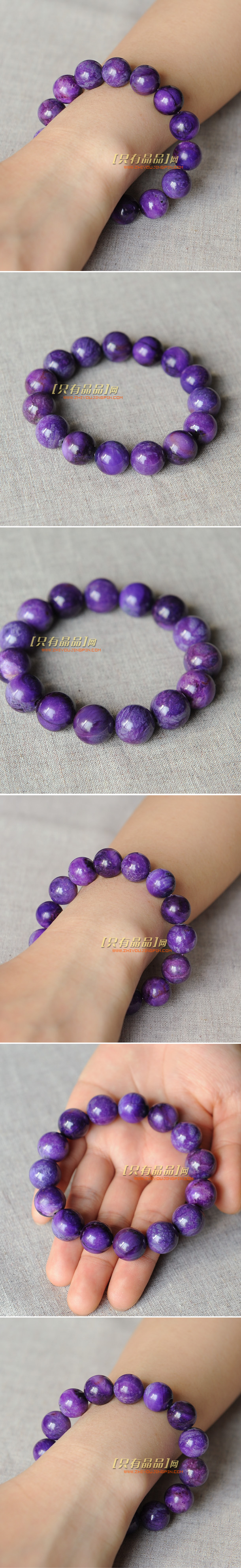极品大颗高贵冷艳皇家紫色舒俱来手链,阳光下偏粉紫色,室内是冷艳紫色。紫色覆盖率高,颜色娇艳,表面水亮,光泽度好。完美度也是大颗舒俱来中很好的,非常值得收藏。