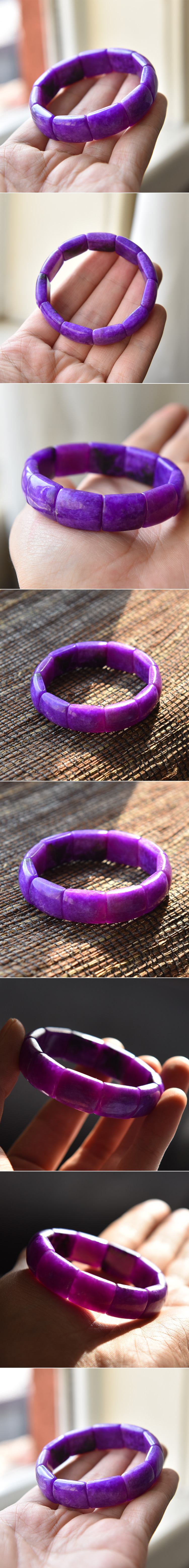 极品浓艳冰糯种紫罗兰色舒俱来手排。这只手镯有着特别浓艳的紫罗兰色,手电或阳光下可以看出冰透的质感,也说明料子非常细腻,玉化感强,特别值得收藏。