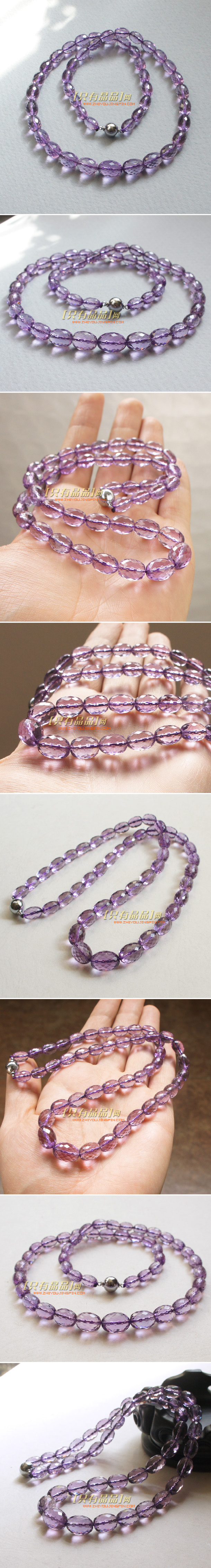 极品超透浅色紫水晶刻面桶珠项链,晶体清透明亮,没有棉絮或冰裂纹。颜色清新淡雅,搭在皮肤上不深不浅,又水润又闪亮。是难得的高品质,高完美的紫晶项链。