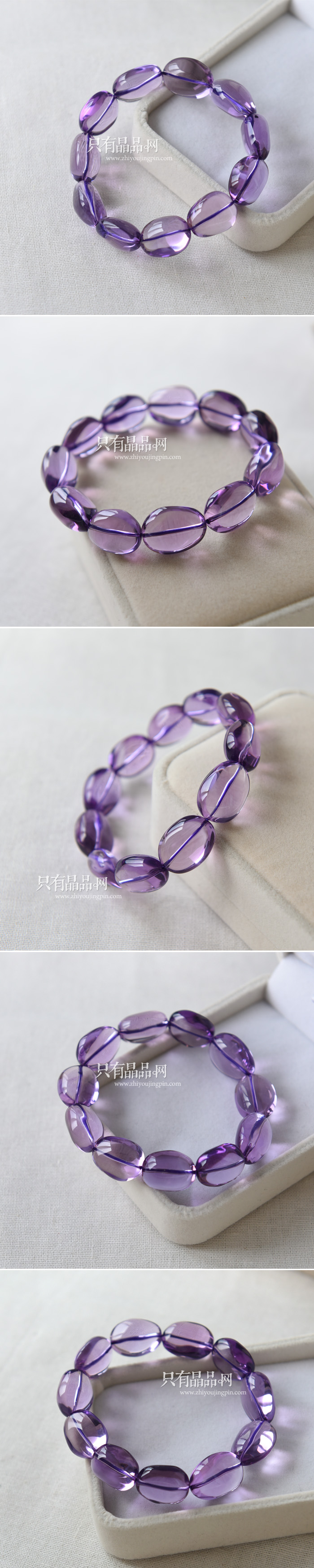 极品高品质高完美紫水晶随形手链。不是一般的随形,每一颗形态都修的浑圆饱满,样子可爱。晶体非常干净,几乎没有杂质,光亮度也特别好,是紫水晶的极致品质。